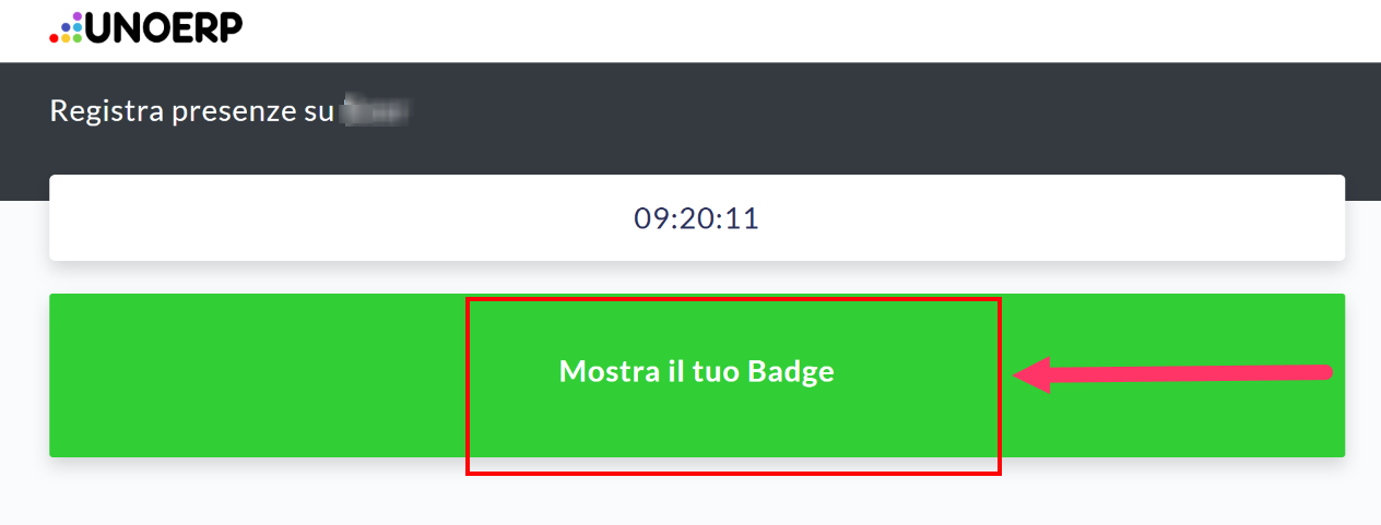 Il dipendente che deve registrare il suo ingresso o la sua uscita dovrà semplicemente toccare il tastone verde [Mostra il tuo Badge] ed esibire il proprio badge con QRCode: